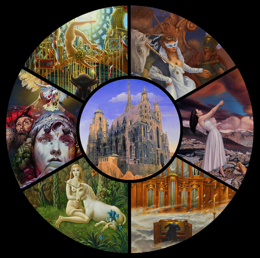 „DALIS ERBEN“ ist eine Initiative des Luxemburgischen Kunsthistorikers Roger Erasmy, der es sich zur Aufgabe gemacht hat, Künstler deren Schaffen dem Geiste Salvador Dalis entspricht, durch gemeinsame Ausstellungen einem weltweiten Publikum vorzustellen. Diese Künstler sind weder Imitatoren seiner Exzentrik noch Epigonen seiner Kunst. Was sie mit Dali verbindet ist ihre Eigenständigkeit, eine Eigenständigkeit von der sie sich, genau so wie Dali, weder durch modische Trends, noch durch Thesen von Kunsttheoretikern abbringen lassen. Die erste Ausstellung von „Dalis Erben“, an der sich zehn phantastische Maler beteiligten, fand 2004 in Lyon statt. Weitere Ausstellungen in vielen Städten Europas wie in den Metropolen Brüssel, Barcelona oder Paris, aber auch in Städten wie Lyon, Le Mont-Dore, Wolnzach, Viechtach, Eggenfelden etc. folgten und zahlreiche Malerinnen und Maler folgten der Einladung Roger Erasmy’s und schlossen sich der internationalen Künstlergruppe an. Die wechselnde Auswahl der ausstellenden Künstler als auch des Ambientes hatten zur Folge, dass jede Ausstellung einen eigenen, unverwechselbaren Eindruck hinterließ und mit den vorangegangenen kaum vergleichbar war. Dies sollte, in besonderem Maße, auch für den ersten Auftritt von „Dalis Erben“ in Wien zutreffen. (Peter Proksch)