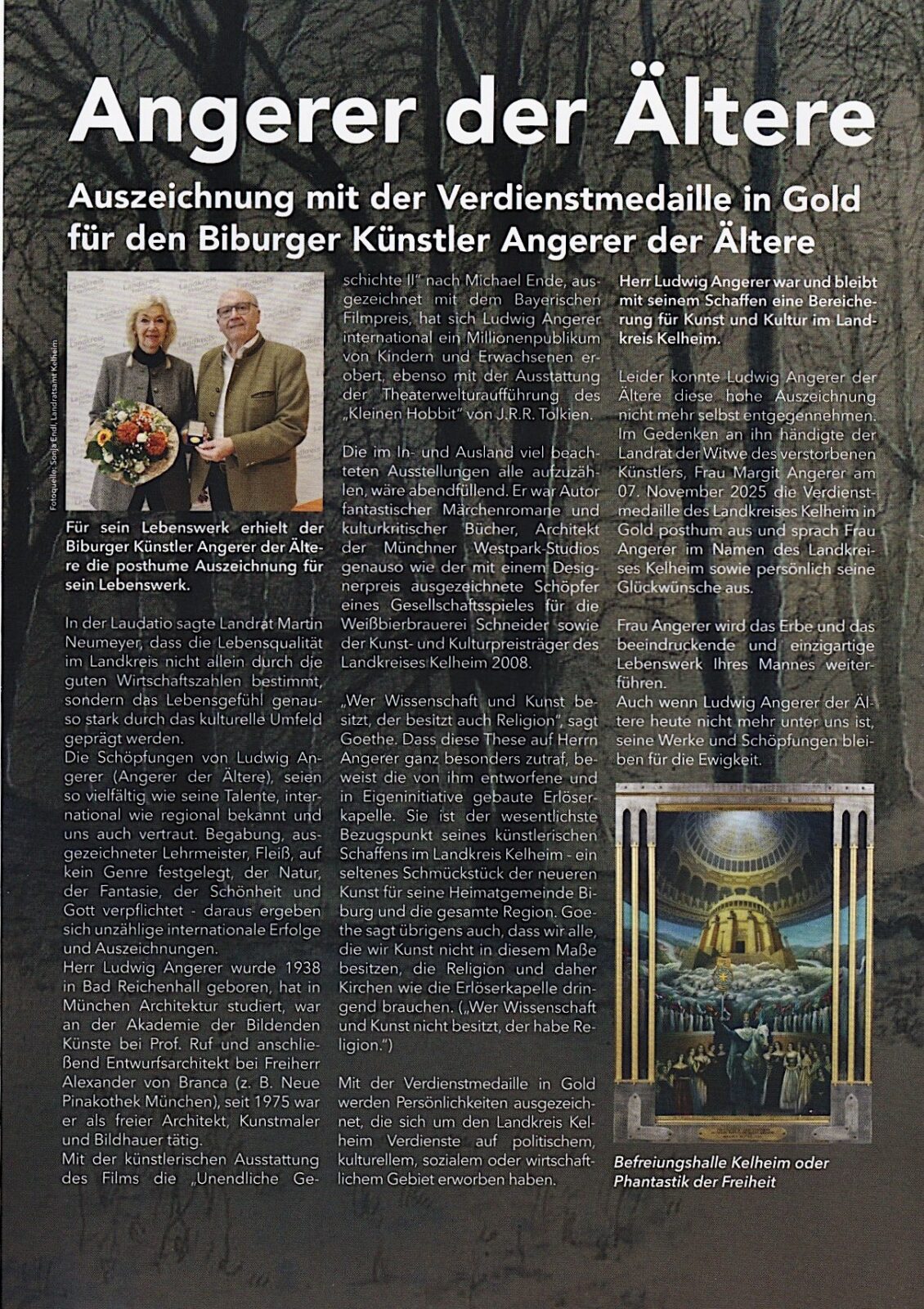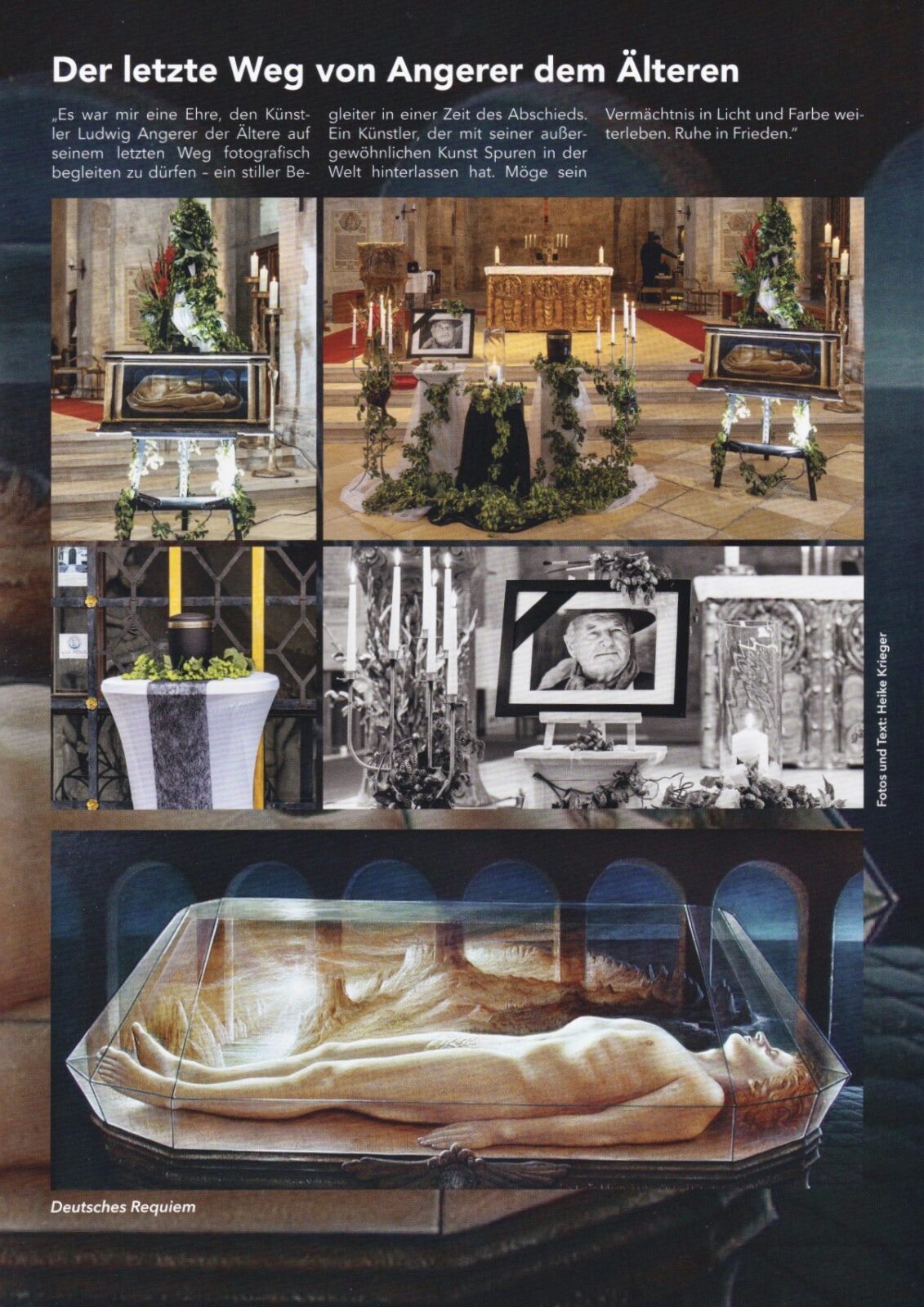 In der vierteljährlichen Zeitung der Gemeinden Biburg, Dürnhart, Altdürnbuch, Etzenbach, Perka, Rappersdorf und Höhenwang, die im Dezember 2025 erschien, wird noch einmal an den Künstler erinnert. Auf dem Titelbild die Klosterkirche, in der das Hl. Seelenamt für Angerer d.Ä. feierlich begangen wurde. Anschließend wurde der Künstler in der von ihm erbauten Erlöserkapelle bestattet. Von weit her reisten die Trauergäste, es kamen enge Freunde und Kunstsammler seiner Werke, um ihm die letzte Ehre zu erweisen. Anschließend traf man sich im Klostercafé um sich noch einmal gemeinsam an die schönen Stunden, die Gespräche und das gemeinsame Leben auf dieser irdischen Welt zu erinnern.