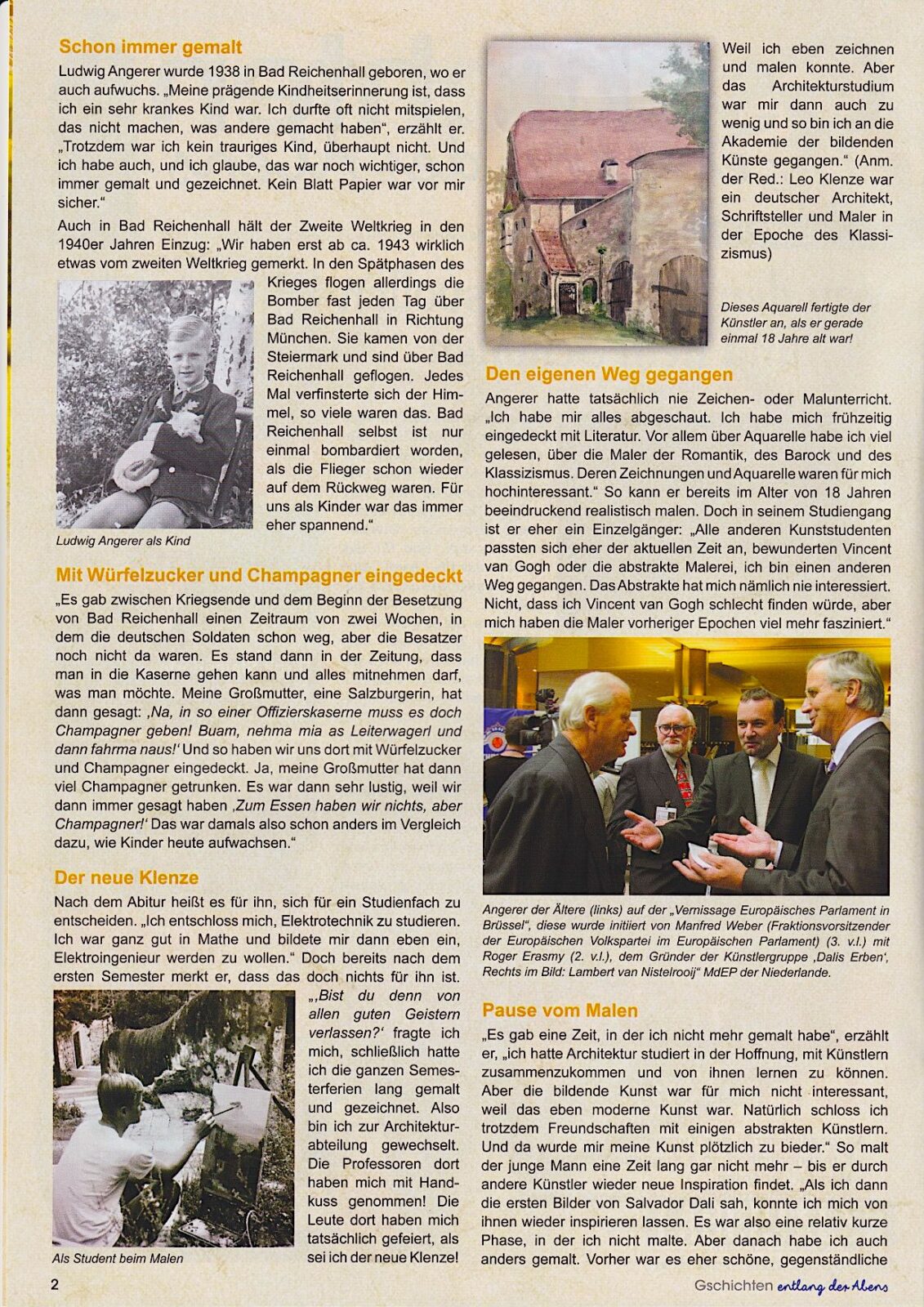 Frau Gallwas besuchte den Künstler in seinem Atelierhaus in Biburg, begleitete ihn zu seinen Werken, unterhielt sich mit ihm und konnte ihm vieles aus seinem privaten Leben und Werdegang entlocken. Ein Auszug aus ihrem ausführlichen Bericht: „Welches ist das berühmteste Gemälde der Welt? Auf diese Frage gibt es wohl nur eine Antwort: Die Mona Lisa von Leonardo da Vinci. Aber warum? Das Gemälde strahlt etwas Mystisches, Geheimnisvolles aus. Und für das Geheimnisvolle kann sich ein Künstler besonders begeistern: Ludwig Angerer der Ältere. Sei es Malerei, Architektur, Bildhauerei oder Film: Er hat schon alles gemacht. Ursprünglich stammt er aus Bad Reichenhall, heute wohnt er in Biburg. Seine Werke haben eine ganz besondere Ausstrahlung, viele von ihnen stellen Welten dar, die man sonst nur im Traum sieht. Dabei war sein Einstieg in die Kunstszene nicht ganz einfach. Er erzählte uns von seiner Beziehung zur Kunst, seiner Kindheit und seinen Quellen der Inspiration.“………..